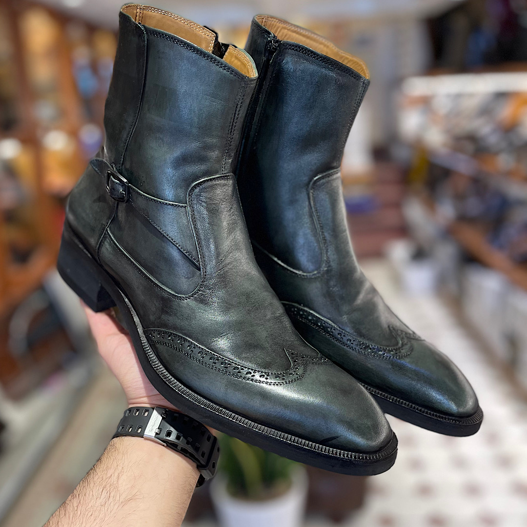 پوتین تمام چرم دستدوز و دسترنگ تبریز مدل داگلاس طوسی مشکی