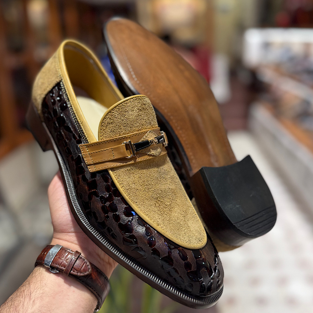 رویه این کفش از ترکیب دو چرم ورنی ایتالیایی و جیر فنیشی تهیه شده است
