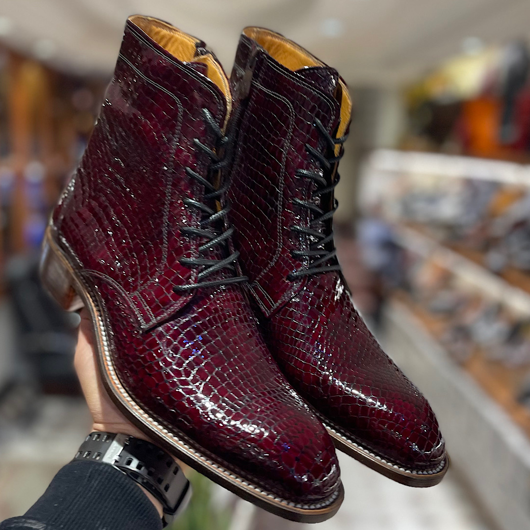 رویه این پوتین از چرم ایتالیایی شرابی ورنی تهیه شده است که این مزیت را دارست که خط و چروک روی چرم نمی افته