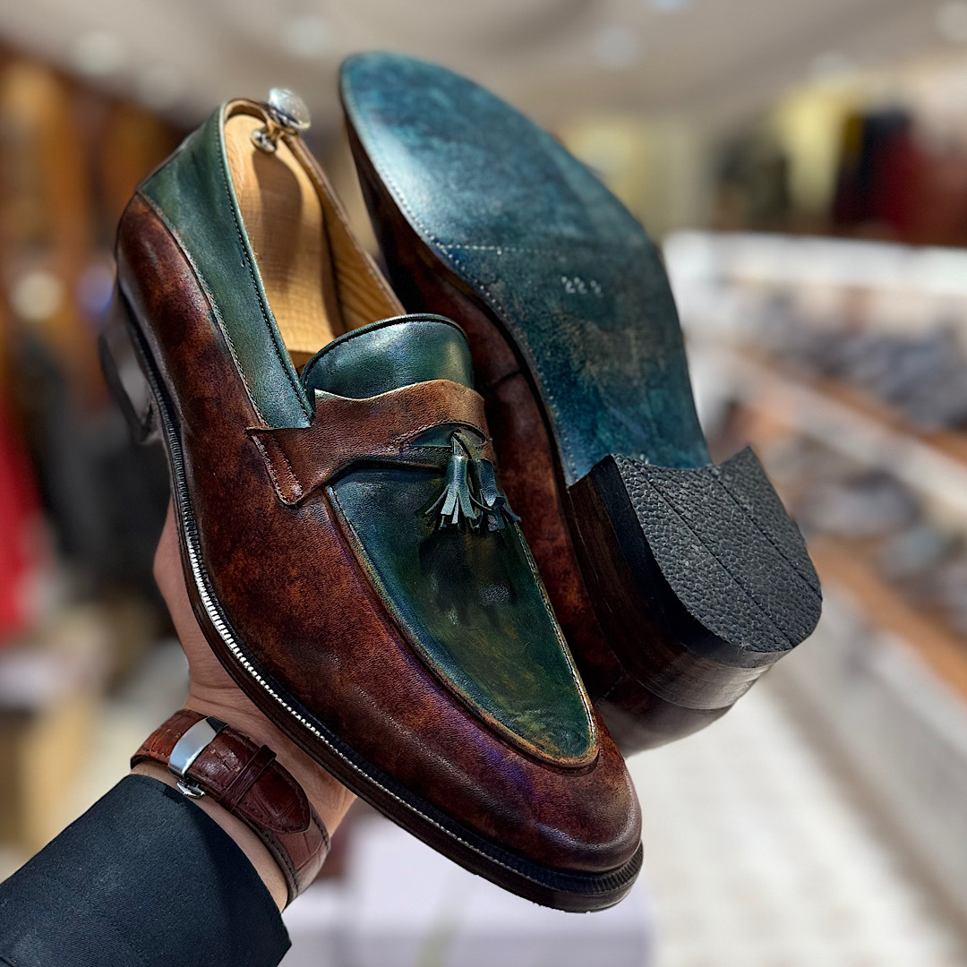 رویه این کفش دستدوز تبریز از چرم فنیشی ایتالیایی ساخته شده است